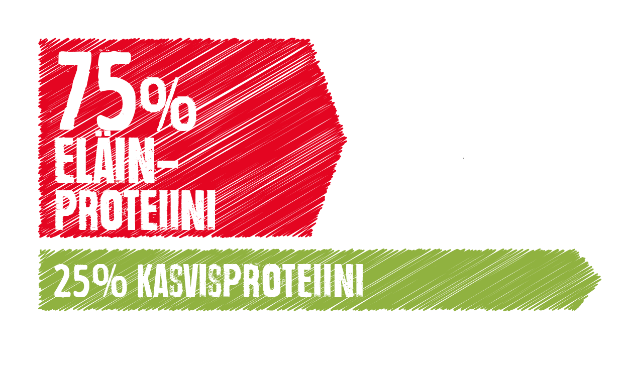 Eläinproteiinin osuus kokonaisproteiinista: 75 % (Siipikarja 65 %, kala 10 %)