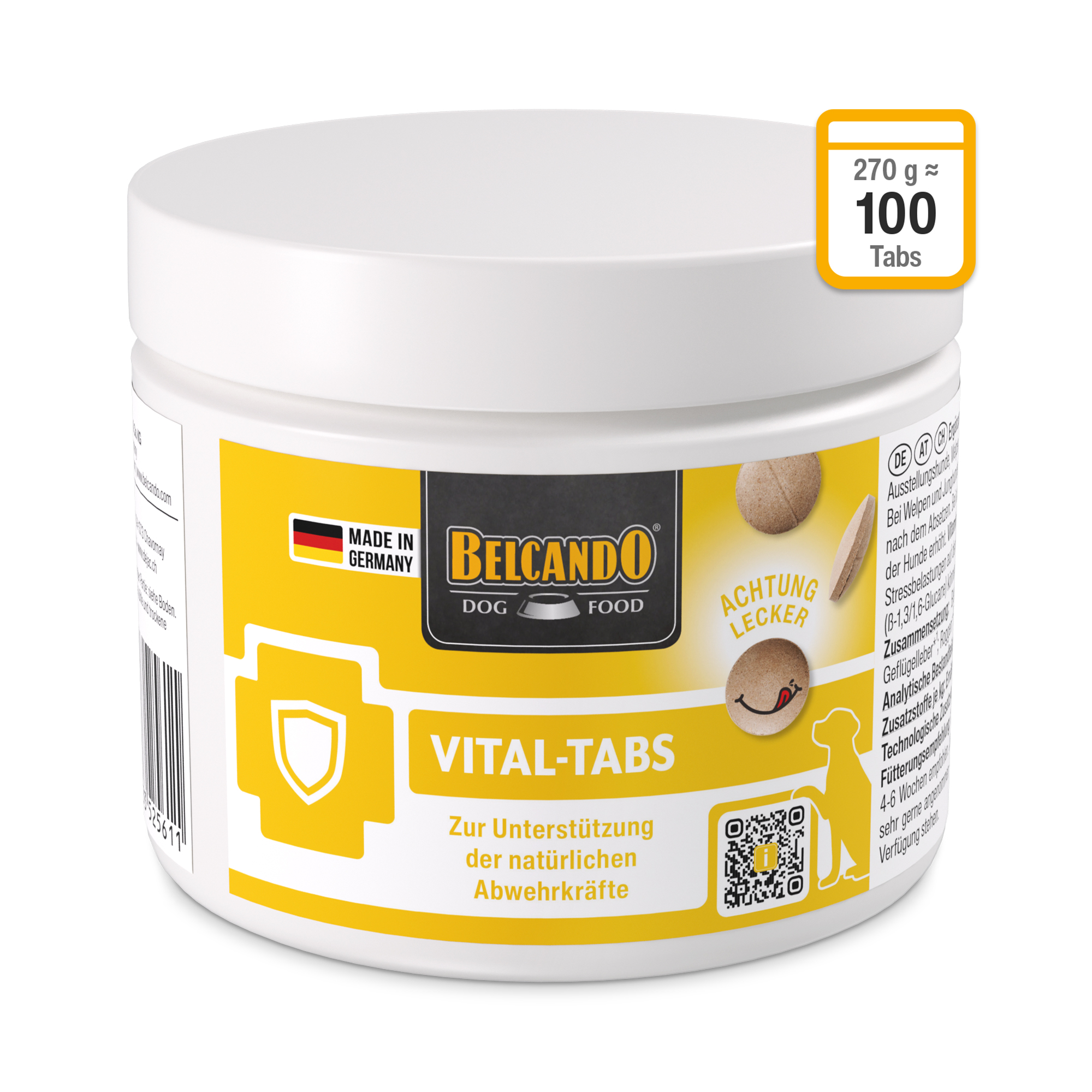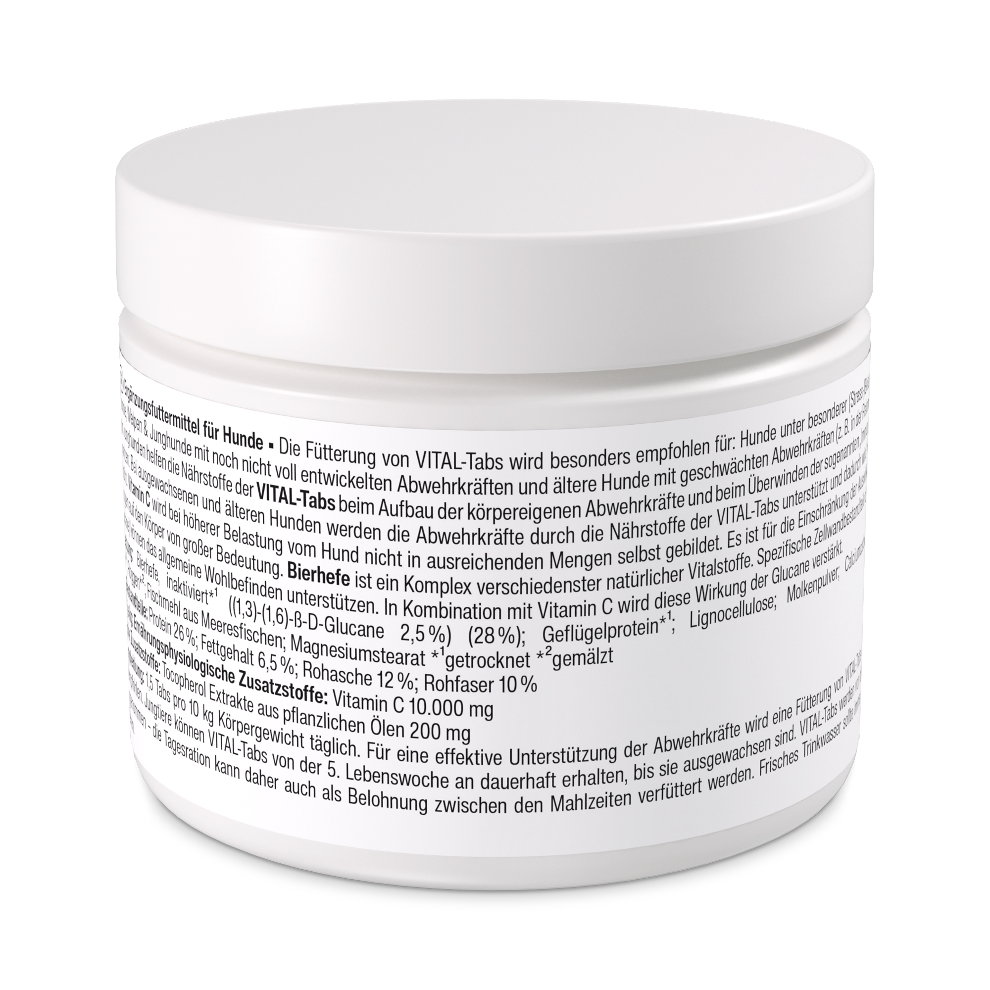 Pennuilla ja nuorilla koirilla VITAL-Tabsin tarjoamat ravintoaineet auttavat rakentamaan kehon omaa immuunipuolustusta ja täyttämään "immuunivajeen" vieroituksen jälkeen. Täysin kasvaneilla ja vanhemmilla koirilla VITAL-Tabsin tarjoamat ravintoaineet tukevat immuunipuolustusta ja lisäävät näin elinvoimaa. Korkean stressin tilanteissa koira ei pysty itse muodostamaan riittävästi C-vitamiinia. On erittäin tärkeää rajoittaa stressin vaikutuksia kehossa. Oluthiiva on yhdistelmä erilaisia luonnollisia ravintoaineita. Panimohiivan tietyt soluseinän komponentit (ß-1,3/1,6-glukaanit) voivat tukea yleistä hyvinvointia. Yhdistettynä C-vitamiiniin glukaanin vaikutus vahvistuu.